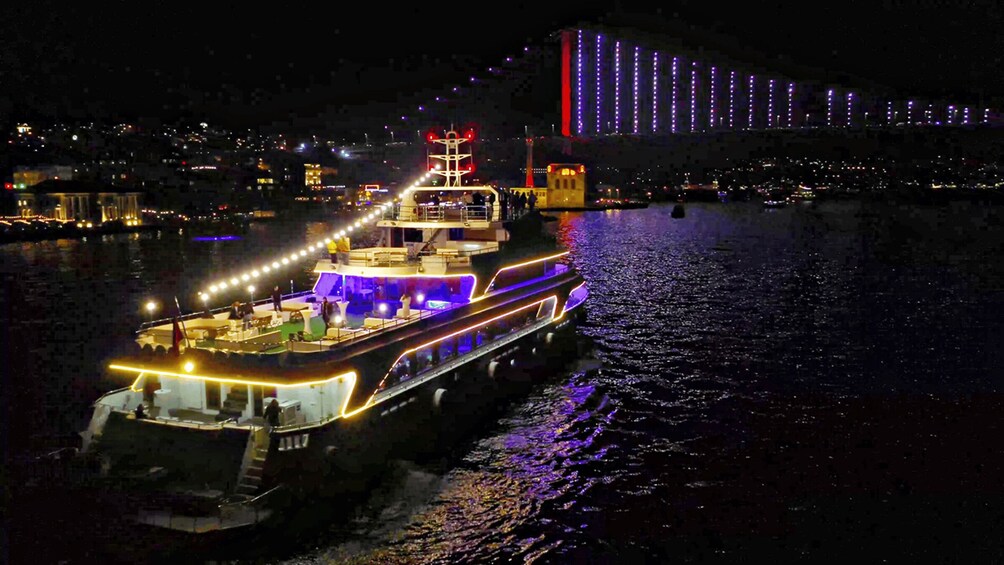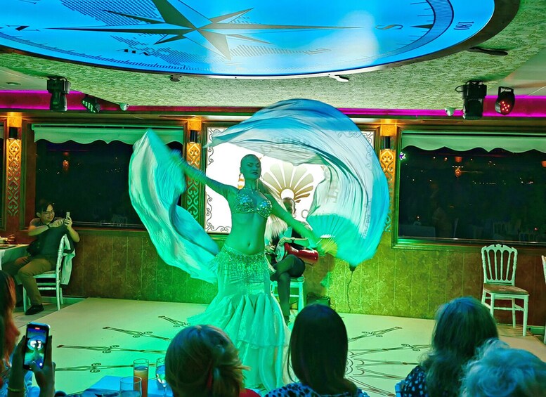 Beinhaltet ein VIP-Dinner-Menü und unbegrenzte alkoholfreie Getränke und unbegrenzte alkoholische Getränke (Wein, Bier, Rakı, Wodka, Gin) an einem privaten Tisch in der VIP-Lounge am Bosporus. Importierte alkoholische Getränke kosten extra. Hoteltransfers inklusive.