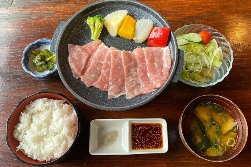 Hida Pork Lunch Set:Premium Hida Pork, eine der besten Schweinefleischmarken Japans. Die Tour beinhaltet ein Hida Pork Mittagessen – eine regionale Spezialität, die für ihre