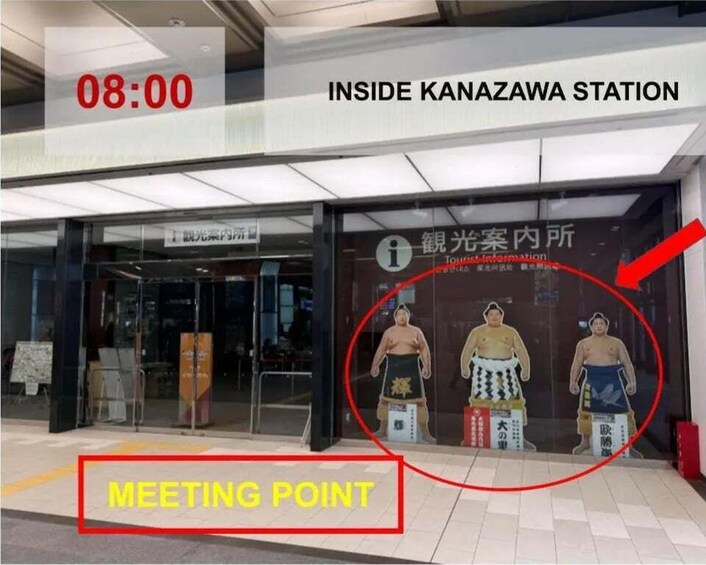 PEOPLE PEOPLE - Japan, 石川県金沢市木ノ新保町1 Kanazawa Station | The meetup point is outside of the Shinkansen ticket gates, in front of the information center. If you are heading out from the Shinkansen gates, look forward and to the right and you will see three large sumo wrestlers lined up. This is where we will be meeting. For those coming from outside the station, you will find this sign immediately inside of the East Entrance of Kanazawa Station. You may wait nearby there until the tour begins at 8:00 A.M. Be sure to look for the guide wearing a Snow Monkey Resorts tour tag.